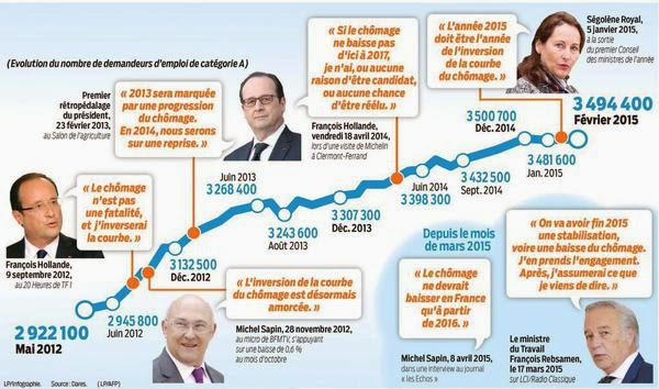 Qu’est-ce qu’elle disait la Ségolène en 2011 ? " Le chômage a encore augmenté, la France n’est ni présidée, ni gouvernée " ! Tiens donc. Et qu’est-ce qu’elle nous dit aujourd’hui ? " L’année 2015 doit être l’année de l’inversion de la courbe du chômage ". T’inquiètes Ségo, on saura s’en souvenir ! Et qu’est-ce qu’il nous dit aujourd’hui Président ? Ben rien. Silence radio. Oups, pardon, il a annoncé la création de 7 centres de service militaire adapté qui pourront accueillir chacun 100 jeunes chômeurs. 700 chômeurs de mpoins, dans six ou douze mois, le temps d’ouvrir ces 7 centres, c’est toujours ça de pris et c’est pas cher, c’est l’Etat qui paye...