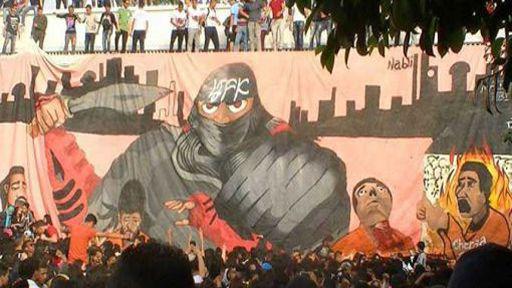 | (Calicots géants à la gloire de Daesch) Et petite sauterie en musique entre d’jeuns dans la cour du lycée... Ces printemps arabes ont quelque chose de, comment dire... de surprenant... Vous noterez le nombre d’étudiants présents ; nous ne sommes pas dans un petit rassemblement spontané entre copains...