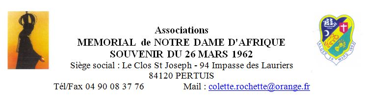 Plus que jamais, au moment où nos rangs s’éclaircissent, il faut absolument unir toutes nos forces pour que notre mémoire puisse, après nous, continuer à défendre l’Histoire et la Vérité sur l’œuvre de la France en Algérie. C’est cela notre Devoir de Mémoire car « les paroles s’envolent, les écrits restent » nous sommes les mieux placés car nous avons pu vérifier cet adage...