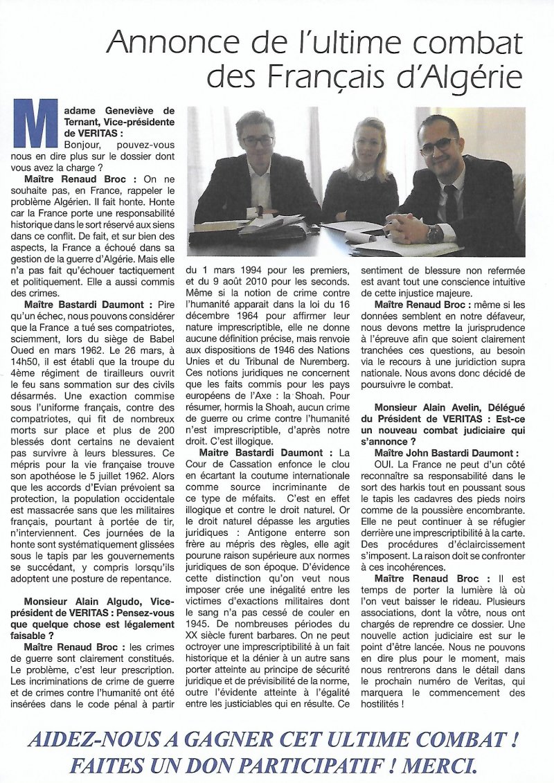Dans sa dernière revue n° 188, VERITAS, qui a trouvé deux bons Avocats motivés, annonce l’éminence d’une nouvelle action judiciaire à laquelle nous devrons nous associer.