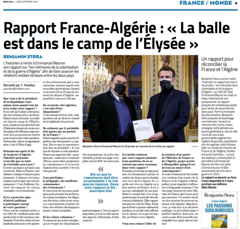 La Fourberie de Benjamin STORA mise en lumière dans MIDI LIBRE d’aujourd’hui :