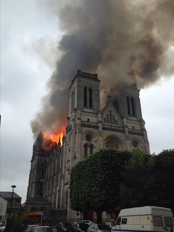 Et paf, le lendemain, la basilique Saint-Donatien de Nantes flambe, sa charpente est entièrement détruite et le bâtiment ne pourra plus accueillir de fidèles pendant de nombreux mois, voire des années... Comment ne pas y voir un signe du ciel... Dieu aurait-il voulu montrer la voie ? : ne pas céder un pouce de terrain à l’Islam, plutôt brûler que de laisser Mahomet pénétrer nos lieux saints ? L’idée n’est-elle pas séduisante ?