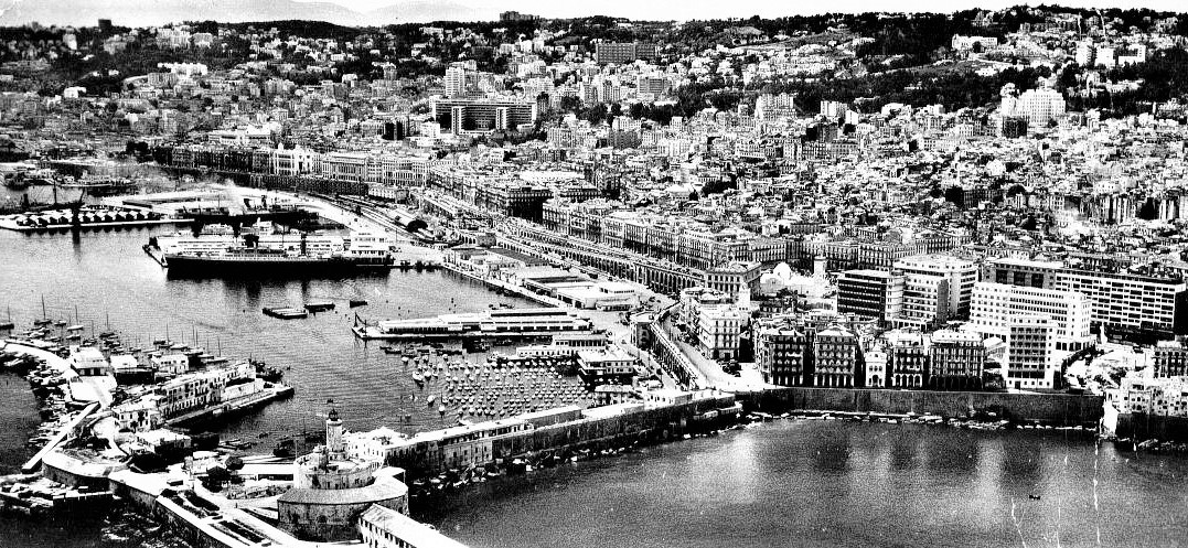 - Année 1960 : Vue d’une petite partie d’Alger la Blanche transformée par la France et les Pieds-Noirs, en seulement un Siècle, en l’une des plus grandes Cités portuaires modernes du bassin méditerranéen.