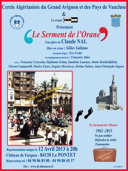 Nous vous rappelons que vendredi prochain, 12 avril 2013 à 20 heures, nous donnerons la deuxième représentation de la pièce "Le Serment de l’Orane" au Château de Fargues, à Avignon-Le Pontet.