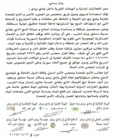 Déclaration de Wadi Barada : « nous laisserons des équipes réparer la source d’eau si l’Armée arabe syrienne et le Hezbollah cessent d’attaquer, si le siège est levé et si le cessez-le-feu est surveillé par des observateurs internationaux. »