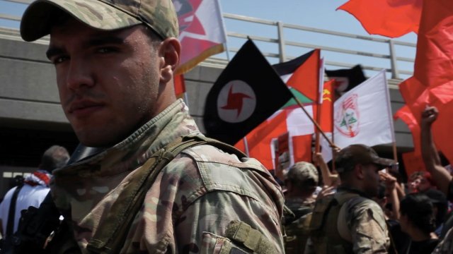 Des manifestants avec un drapeau palestinien, un soldat en arrière-plan