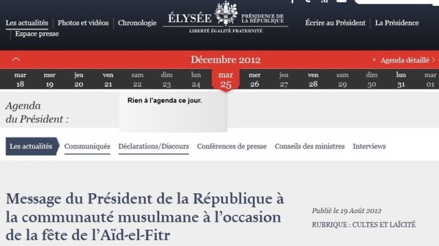 Aucun vœux du Président Hollande à l’occasion de Noël sur le site de l’Élysée. En revanche pour l’Aïd-el-Fitr :