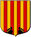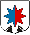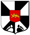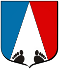 Tiercé en pointe d’azur, d’argent et de gueules, l’argent chargé d’une plante de pied dextre et d’une senestre de sable mouvant de la pointe.