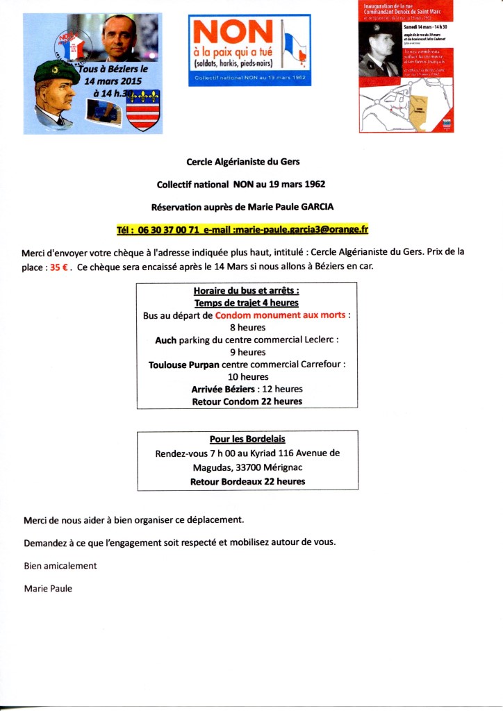 Georges Belmonte propose aux Pieds-Noirs de Gironde qui souhaitent de se joindre à cette manifestation d’organiser :